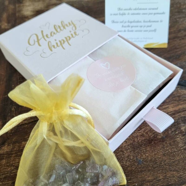 Elke bestelling wordt verzonden in een mooi doosje of een andere originele verpakking. Als het een cadeau voor iemand anders is vermeld dit dan bij je bestelling zodat we je bestelling kunnen inpakken en/of extra verpakkingsmateriaal meesturen.